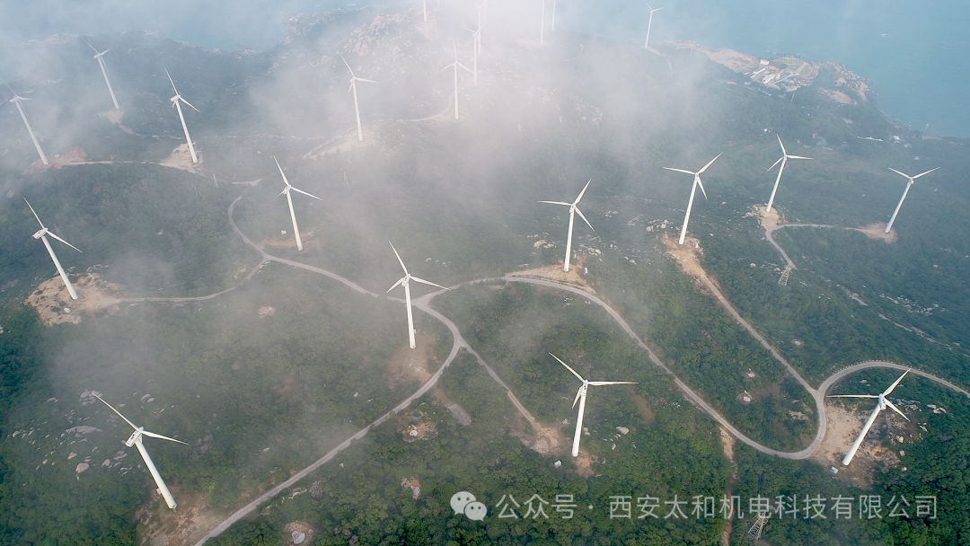 在雾气笼罩的山地风光间,几座风力发电机矗立在蜿蜒小径旁,格外引人注目。清晨薄雾为这片土地增添神秘色彩,它们在雾中若隐若现,与自然和谐共舞。 西安太和机电科技有限公司立足风力发电消防业务多年,一直秉承“太融万物,和合致远”的发展理念。这些风力发电机不仅是大自然的点缀,更是人类智慧结晶,它们将风力转化为电能,带来清洁可持续能源,代表着我们对环保和可持续发展的承诺,是绿色能源的重要标志。 路径曲折蜿蜒,象...
